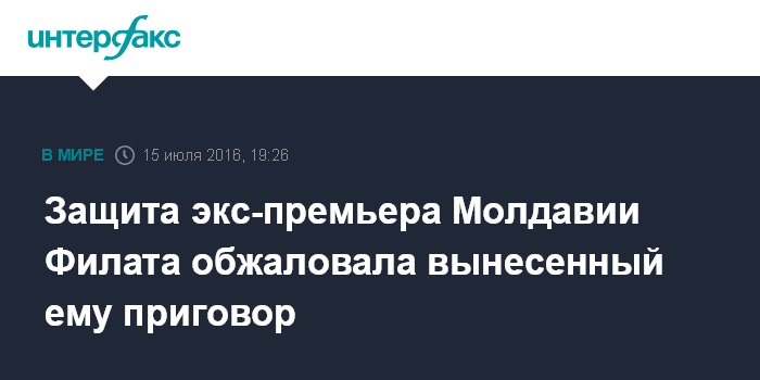 Москва. 15 июля. INTERFAX.RU - Адвокаты бывшего премьер-министра Молдавии Влада Филата, получившего 9 лет лишения свободы по делу о коррупции и извлечении выгоды из влияния, направили жалобу на вынесенный ему приговор.