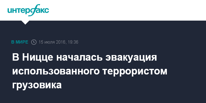 Москва. 15 июля. INTERFAX.RU - Эвакуация грузовика, на котором террорист врезался в толпу людей в Ницце, проводится в пятницу вечером на городской набережной, сообщают французские СМИ.