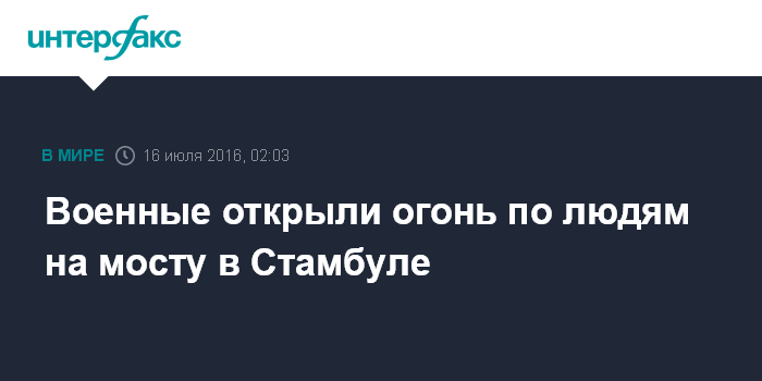 Москва. 16 июля. INTERFAX.RU - Военные открыли огонь в Стамбуле, по людям, пытавшимся подойти к мосту через Босфор, сообщает агентство Associated Press.