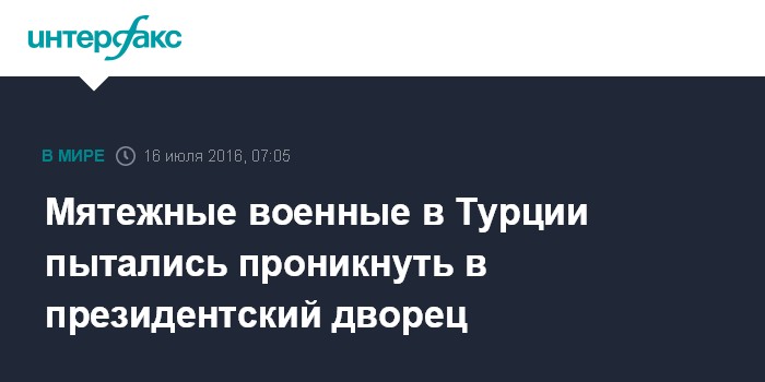 Москва. 16 июля. INTERFAX.RU - Ряд турецких военных, которые приняли участие в попытке военного переворота в Турции, пытались проникнуть в президентский дворец в столице страны, сообщило агентство Associated Press.