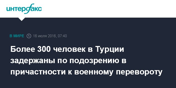 Москва. 16 июля. INTERFAX.RU - Турецкие власти задержали по подозрению в причастности к попытке военного переворота в стране 336 человек, сообщают местные СМИ со ссылками на официальные источники.