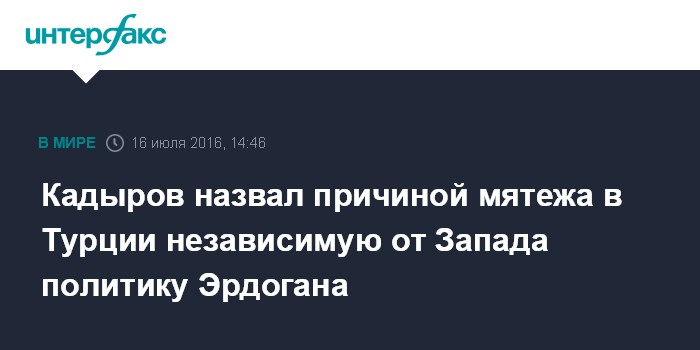 Москва. 16 июля. INTERFAX.RU - Возможной причиной попытки военного переворота в Турции стала более независимая политика президента Турции Реджепа Тайипа Эрдогана от прозападно настроенных генералов, считает глава Чеченской республики Рамзан Кадыров.