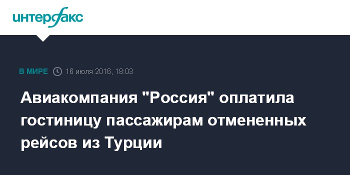 Москва. 16 июля. INTERFAX.RU - Авиакомпания "Россия" оплатила проживание в гостинице пассажирам отмененных в субботу рейсов из Турции в Москву, вопрос по организации их вывоза пока решается, сообщил "Интерфаксу" официальный представитель перевозчика.