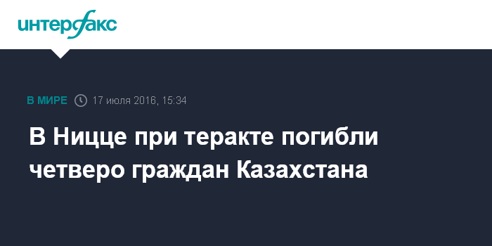 Москва. 17 июля. INTERFAX.RU - Жертвами теракта во французской Ницце стали четверо граждан Казахстана, сообщил МИД республики.