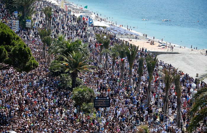 Тысячи людей, в частности, вышли на набережную в Ницце, где была совершена атака. Многие люди держали в руках цветы.