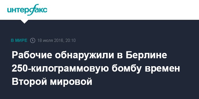 Москва. 18 июля. INTERFAX.RU - В берлинском районе Руммельсбург в понедельник проведена эвакуация местных жителей после того, как рабочие нашли 250-килограммовую американскую бомбу времен Второй мировой войны, сообщает полиция Берлина.
