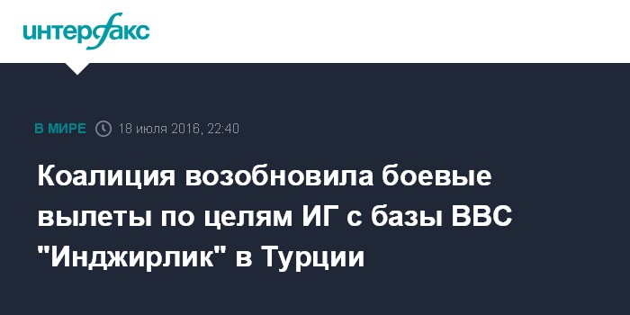 Москва. 18 июля. INTERFAX.RU - Операции, которые проводит американская авиация по целям "Исламского государства" (ИГ, террористическая группировка, запрещенная в России - ИФ), с базы ВВС Турции "Инджирлик" возобновлены с воскресенья, говорится в заявлении, распространенном в понедельник Пентагоном.