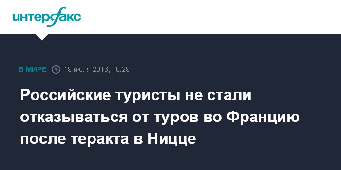 "Туроператоры считают, что первый шок от случившегося в минувший четверг уже прошел, ситуация с продажами Франции нормализовалась. Хотя она особенно и не менялась в эти дни: туристы не только не отказывались от забронированных и оплаченных туров, но даже редко волновались по поводу безопасности предстоящего отдыха. Скорее их интересовал вопрос - не сорвется ли теперь отпуск на Лазурном берегу. Представители турбизнеса надеются, что к осени, когда традиционно увеличивается число экскурсионных туров в Европу, ситуация во Франции окончательно стабилизируется", - заявила Тюрина.