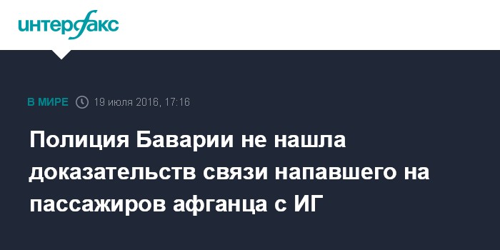 Москва. 19 июля. INTERFAX.RU - Доказательства, что 17-летний афганский беженец, напавший с топором на пассажиров поезда Тройхтлинген-Вюрцбург, имел связи с организацией "Исламское государство" (запрещена в РФ), отсутствуют, сообщил во вторник министр внутренних дел Баварии Йоахим Херманн.