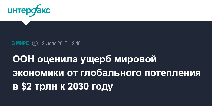 Москва. 19 июля. INTERFAX.RU - Глобальное потепление будет ежегодно наносить мировой экономике ущерб более чем в 1,5 трлн фунтов стерлингов (два трлн долл) к 2030 году из-за снижения производительности труда, сообщается в исследовании Организации объединенных наций (ООН).