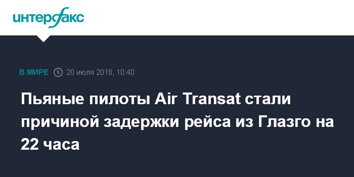 Москва. 20 июля. INTERFAX.RU - Рейс канадской авиакомпании Air Transat из Глазго в Торонто был задержан на 22 часа после ареста двух пилотов в шотландском аэропорту по подозрению в употреблении алкоголя перед вылетом, сообщает CTV News.