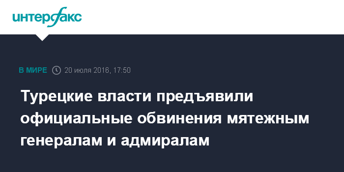 Москва. 20 июля. INTERFAX.RU - Власти Турции предъявили официальные обвинения задержанным высокопоставленным офицерам, принимавшим участие в попытке военного переворота в ночь с 15 на 16 июля, сообщает "Би-би-си". Всего обвинения выдвинуты 99 генералам и адмиралам.