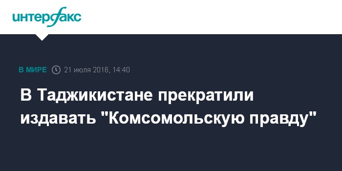 Москва. 21 июля. INTERFAX.RU -В Таджикистане прекращено издание "Комсомольской правды", заявил на пресс-конференции в Душанбе в четверг глава медиа-холдинга "Оила", который 10 лет занимался печатью и распространением газеты в Таджикистане Шариф Хамдампур.