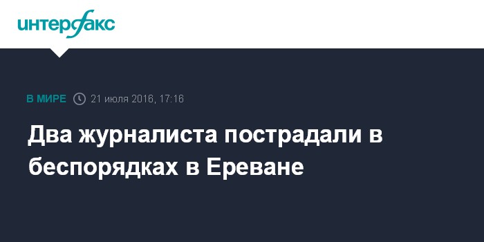 Москва. 21 июля. INTERFAX.RU - Два журналиста пострадали в четверг во время разгона полицией демонстрантов в Ереване, сообщили "Интерфаксу" в офисе защитника прав человека Армении.