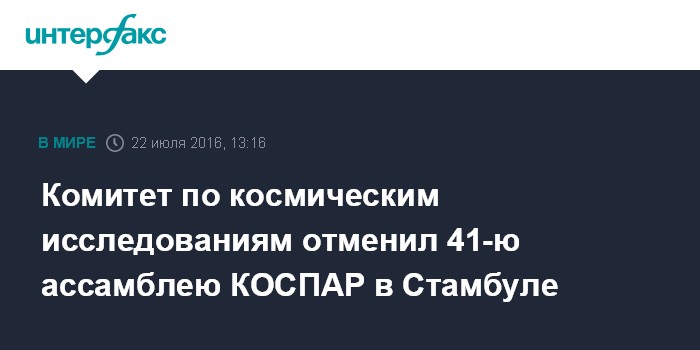 Москва. 22 июля. INTERFAX.RU - Ассамблея международного Комитета по космическим исследованиям (КОСПАР), которая должна была пройти с 30 июля по 7 августа в Стамбуле, отменена по соображениям безопасности, сообщает КОСПАР.