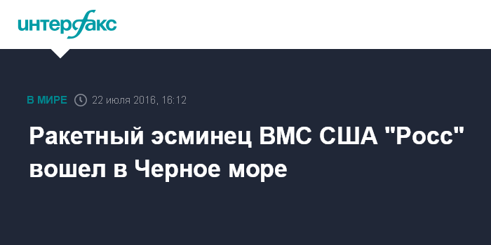 Москва. 22 июля. INTERFAX.RU - Ракетный эсминец ВМС США "Росс", оснащенный системой ПРО "Иджис", в пятницу вошел в акваторию Черного моря. Об этом сообщили местные информационные порталы, публикующие фотографии его прохождения через пролив Босфор.