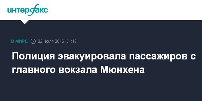 Москва. 22 июля. INTERFAX.RU - Пассажиры эвакуированы с главного железнодорожного вокзала Мюнхена в рамках операции по поиску преступников, учинивших стрельбу в торговом центре "Олимпия", сообщил в пятницу германский телеканал АРД.