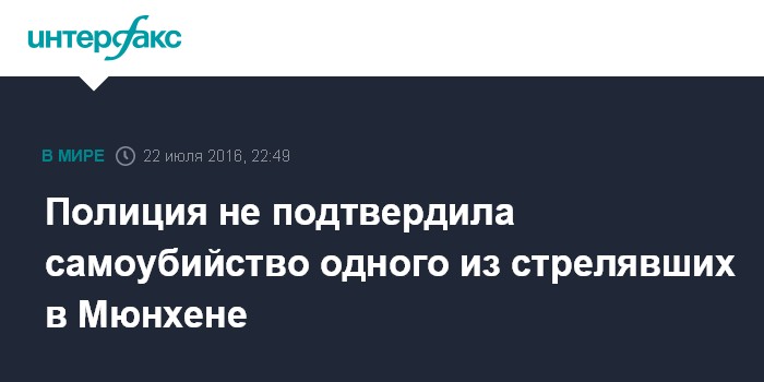 Москва. 22 июля. INTERFAX.RU - Официальный представитель полиции Мюнхена в ходе брифинга не подтвердил информацию о самоубийстве одного из стрелявших.