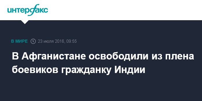 Москва. 23 июля. INTERFAX.RU - Гражданка Индии, похищенная более месяца назад боевиками в Кабуле, освобождена и вечером в сопровождении посла страны в Афганистане Манпрета Вохра (Manpreet Vohra) прилетит в Дели, сообщили в субботу афганские СМИ со ссылкой на индийскую дипмиссию.