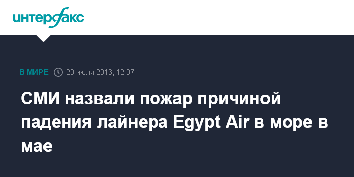Москва. 23 июля. INTERFAX.RU - Самолет авиакомпании Egypt Air, рухнувший в мае в Средиземное море, загорелся во время полета, пишет The New York Times со ссылкой на полученные в ходе расследования данные.