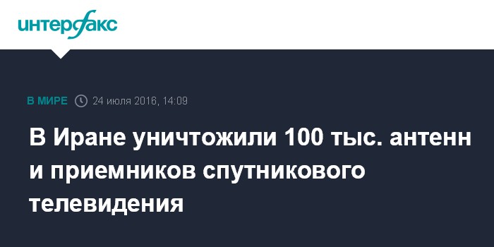Москва. 24 июля. INTERFAX.RU - Не менее 100 тыс. спутниковых "тарелок" и приемников уничтожены в Иране в рамках операции по пресечению распространения в стране незаконных приемных устройств, сообщает в воскресенье иранская пресса.