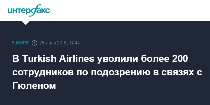 Москва. 25 июля. INTERFAX.RU - Руководство авиакомпании Turkish Airlines объявило в понедельник о решении уволить 211 сотрудников, которые могут быть связаны с проповедником Фетхуллахом Гюленом.