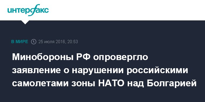 Москва. 25 июля. INTERFAX.RU - В Минобороны России опровергли заявление министра обороны Болгарии Николая Немчева о том, что российские военные самолеты, стали чаще совершать нарушения в болгарской зоне ответственности воздушного пространства НАТО.