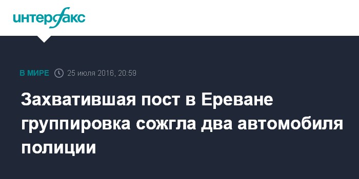 Москва. 25 июля. INTERFAX.RU - Захватившая здание полиции в Ереване вооруженная группировка вечером в понедельник сожгла два служебных автомобиля, рассказали в пресс-службе полиции республики.