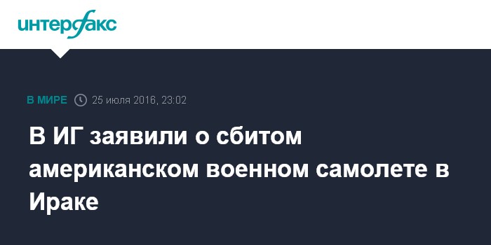 Москва. 25 июля. INTERFAX.RU - Террористы из ИГ ("Исламское государство", группировка запрещена в РФ - ИФ) объявили, что им удалось сбить самолет ВВС США в небе над Ираком, сообщают западные СМИ.