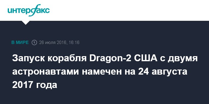 "Запуск пилотируемого корабля Dragon-2 в пилотируемом режиме планируется на 24 августа 2017 года", - сказал источник.