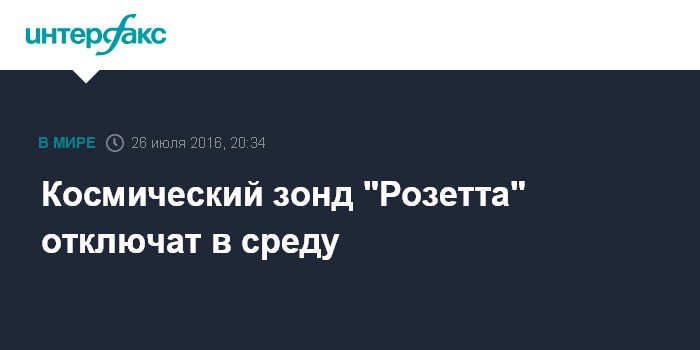 Москва. 26 июля. INTERFAX.RU - Блок связи на европейском космическом аппарате "Розетта", принимающем сигналы от посадочного модуля "Филы" на комете Чурюмова-Герасименко, отключат навсегда 27 июля, сообщает в твиттере Европейское космическое агентство (ЕКА).