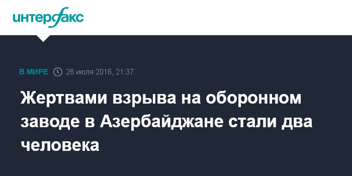 Москва. 26 июля. INTERFAX.RU - В результате взрыва на заводе "Араз" в Азербайджане погибли два человека, сообщает Миноборонпром республики.