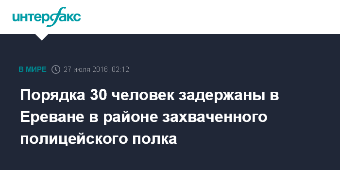 Москва. 27 июля. INTERFAX.RU - Около 30 человек задержаны полицией на территории близ захваченного вооруженной группировкой патрульно-постового полка в Ереване, сообщает корреспондент "Интерфакса".