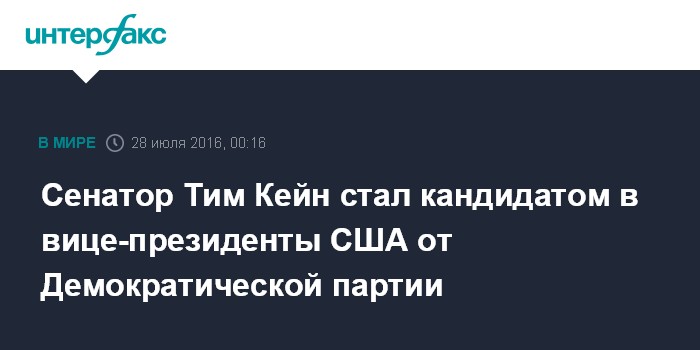 Москва. 28 июля. INTERFAX.RU - Сенатор от штата Виргиния Тимоти (Тим) Кейн в среду официально утвержден кандидатом в вице-президенты США от Демократической партии на общенациональном партийном съезде в Филадельфии.