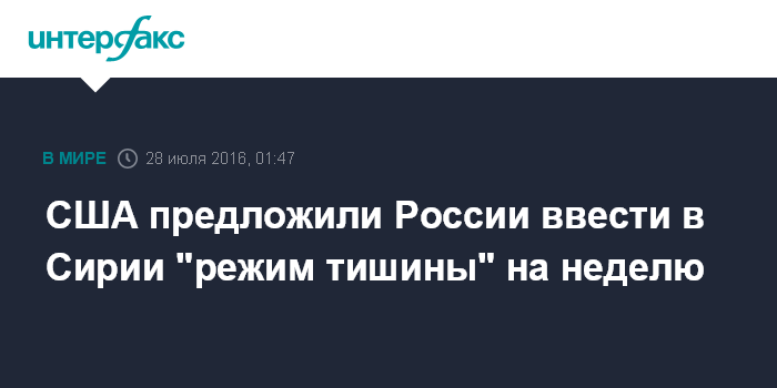 Москва. 28 июля. INTERFAX.RU - Американская делегация на переговорах главы МИД России Сергея Лаврова и госсекретаря США Джона Керри в Москве 14-15 июля и на полях саммита АСЕАН 26 июля предложила ввести в Сирии "режим тишины" на семь дней для размежевания умеренной оппозиции и террористов, сообщает в четверг газета "Известия" со ссылкой на источник, знакомых с ходом переговоров.