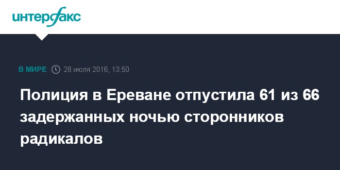 Москва. 28 июля. INTERFAX.RU - Полиция Армении в минувшую среду подвергла приводу в отделения 66 человек с территории близ захваченного вооруженной группировкой полка патрульно-постовой службы в Ереване.