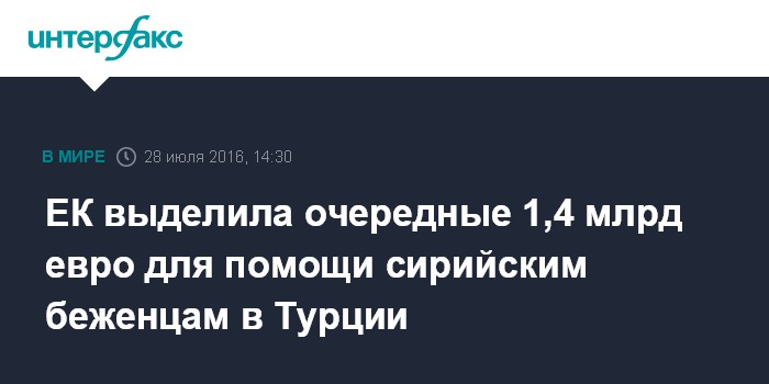 Москва. 28 июля. INTERFAX.RU - Европейская комиссия приняла решение о специальных мерах на сумму в 1,4 млрд евро для поддержки сирийских беженцев в Турции и принимающих их общин, заявила официальный представитель ЕК Мина Андреева.