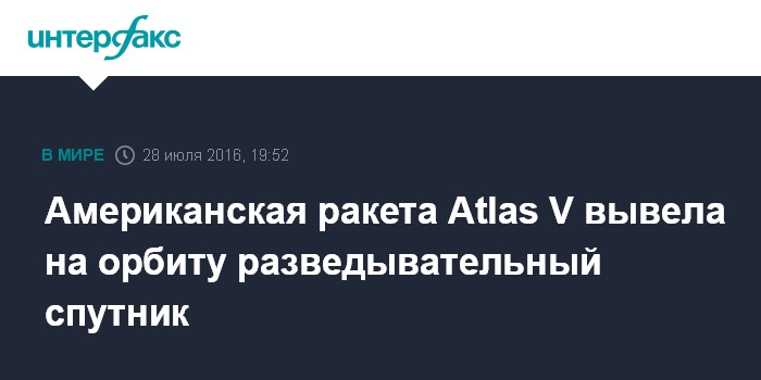 Москва. 28 июля. INTERFAX.RU - Американская ракета-носитель Atlas V вывела на орбиту спутник Национального управления военно-космической разведки США (NRO), сообщает NBC News. Запуск произведен сегодня утром с космодрома на мысе Канаверал во Флориде.