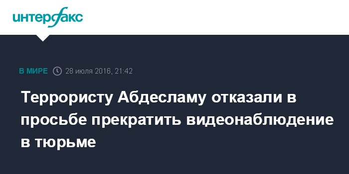 Москва. 28 июля. INTERFAX.RU - Государственный совет Франции отказал в четверг участнику парижских терактов 13 ноября 2015 года Салаху Абдесламу в просьбе отменить постоянное видеонаблюдение в тюремной камере. Об этом сообщают французские СМИ со ссылкой на коммюнике высшей судебной инстанции страны по административным делам.