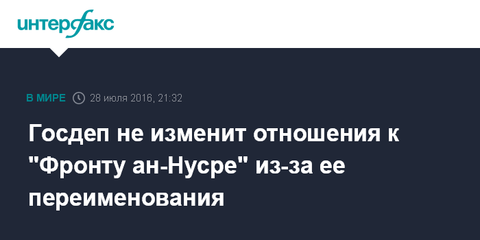 Москва. 28 июля. INTERFAX.RU - Объявление группировки "Фронт ан-Нусра" (запрещена в РФ) о переименовании и разрыве связей с "Аль-Каидой" (запрещена в РФ) не означает, что она перестает считаться террористической, заявил в четверг представитель госдепа США Джон Кирби.