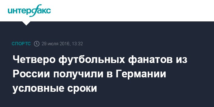 Москва. 29 июля. INTERFAX.RU - Четверо российских фанатов, которые в прошлом месяце подрались с туристами из Испании в германском Кельне, получили условные сроки, сообщило в пятницу агентство Associated Press со ссылкой на решение кельнского окружного суда