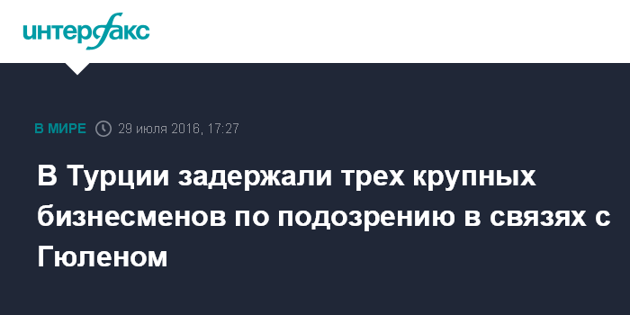 Москва. 29 июля. INTERFAX.RU - Власти Турции задержали трех крупных бизнесменов в рамках расследования, связанного с деятельностью находящегося в США проповедника Фетхуллаха Гюлена, сообщили в пятницу турецкие СМИ.
