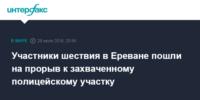 Утром 17 июля группа вооруженных лиц захватила здание полиции в Ереване. При этом они убили полицейского и четырех человек ранили. Радикалы потребовали освобождения координатора армянской оппозиционной гражданской инициативы "Учредительный парламент" Жирайра Сефиляна, находящегося под арестом по обвинению в незаконном приобретении и хранении оружия. Члены вооруженной группы также требуют отставки президента и правительства, формирования правительства доверия.