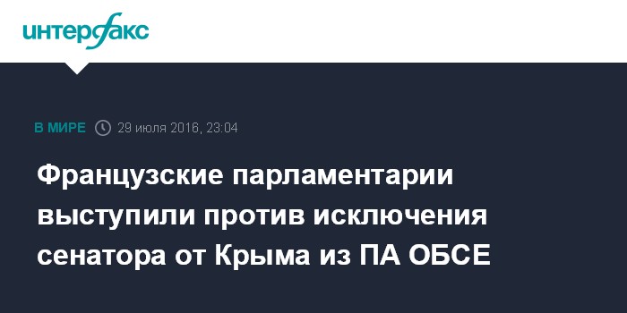 "Делегация Франции в парламентской ассамблее ОБСЕ опротестовала решение об исключении сенатора от Крыма из состава парламентской делегации России в ОБСЕ. Теперь мы будем ждать реакции, это (протест - ИФ) должно быть рассмотрено на сессии парламентской ассамблеи ОБСЕ", - сказала Ковитиди журналистам в пятницу.