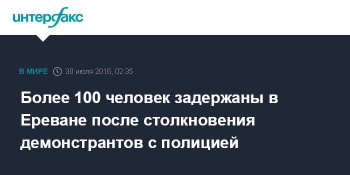 Москва. 30 июля. INTERFAX.RU - Более ста человек подвергнуты приводу в отделения полиции в Ереване в результате столкновения демонстрантов с правоохранителями и разгона митинга в поддержку захватчиков полицейского полка.