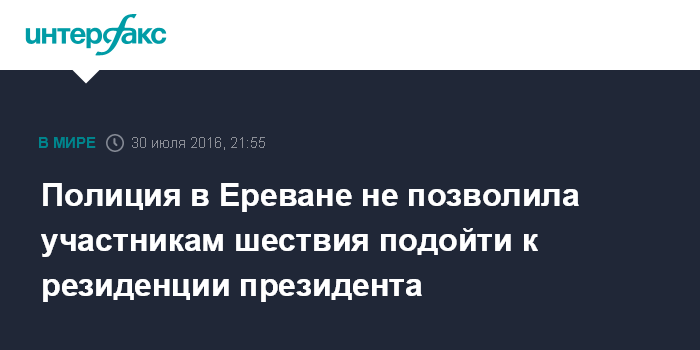 Москва. 30 июля. INTERFAX.RU - Полиция Армении сконцентрировала силы на подходах к проспекту Баграмяна в Ереване, где располагается резиденция президента республики, здание парламента и ряда посольств.