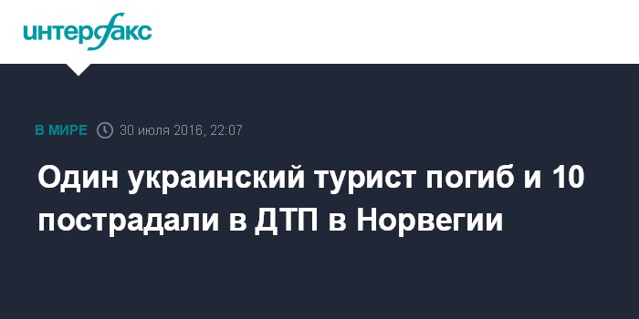 Москва. 30 июля. INTERFAX.RU - ДТП с участием туристического автобуса произошло в субботу вечером в 100 км от города Олесунн в Норвегии, в результате один гражданин Украины погиб, от восьми до 10 граждан Украины получили травмы различной степени тяжести, сообщает департамент консульской службы МИД Украины.