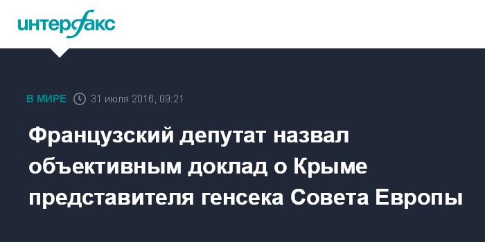 Москва. 31 июля. INTERFAX.RU - Руководитель французской делегации Тьерри Мариани заявил, что представитель генсека Совета Европы Жерар Штудман подготовил объективный доклад о ситуации в Крыму.