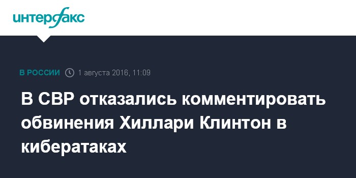 Москва. 1 августа. INTERFAX.RU - В Службе внешней разведки (СВР) РФ воздерживаются от комментариев по поводу утверждений Хиллари Клинтон, обвинившей российскую разведку во взломе серверов Демократической партии США.