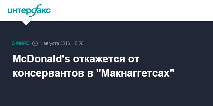 Москва. 1 августа. INTERFAX.RU - Сеть ресторанов быстрого питания McDonalds Corp откажется от использования искусственных консервантов в блюде "Чикен Макнаггетс", а также прекратит добавлять их в завтраки, включая сосиски и омлеты, сообщает The Wall Street Journal.